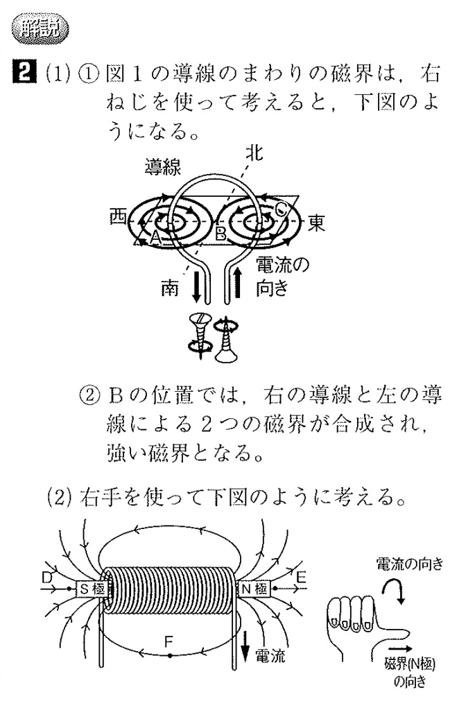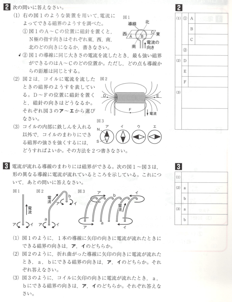 中2理科 Exercise 4-9 (2025) 未分類 2026.01.21 解答 2(1) ①A:北 B:南 C:北 ② B(2) D:エ E:エ F:ウ(3)・電流(または電圧)を大きくする。 ・コイルの巻き数を多くする。3(1) ア(2) a:ア b:イ(3) a:ア b:ア